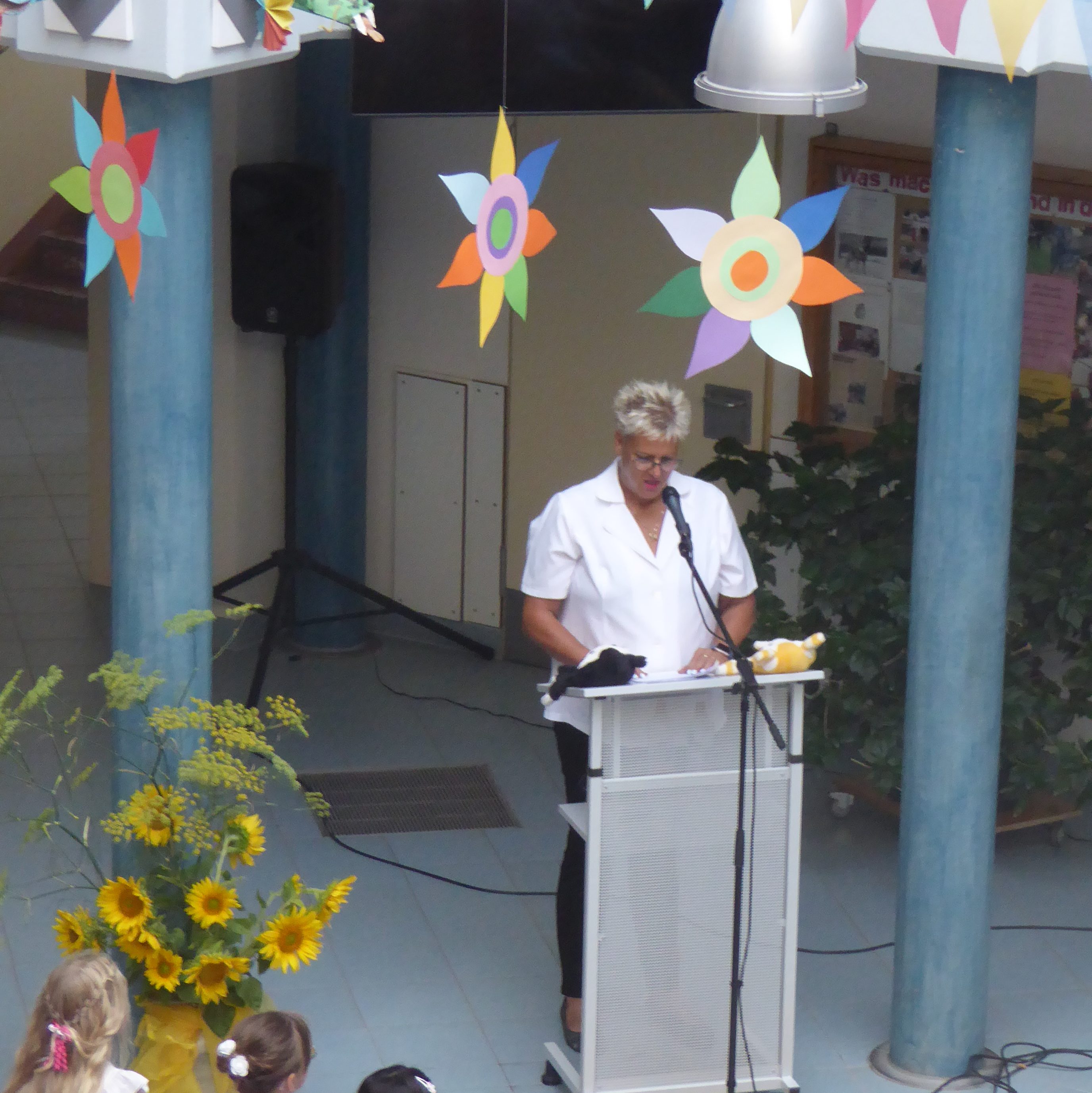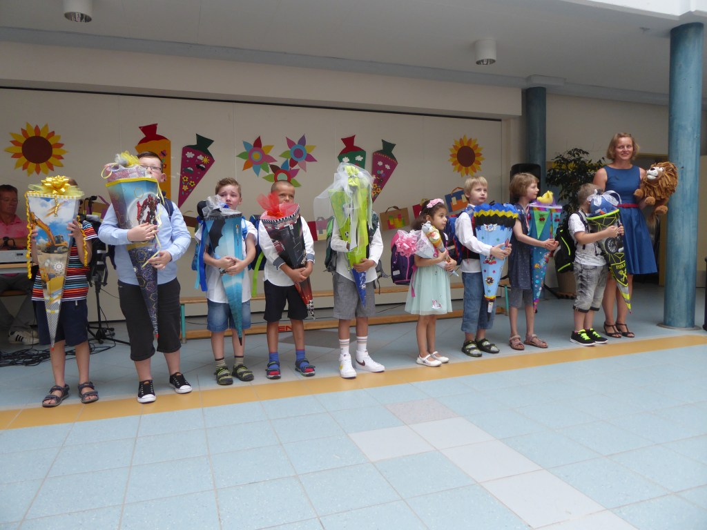 Die Direktorin heißt die neuen SchülerInnen der Schule willkommen. Danach überreichen die Eltern die Schultüten und die SchülerInnen dürfen ihren Klassenraum sehen, in dem ab Montag fleißig gelernt wird.