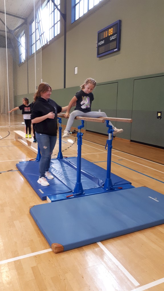 Am 22. September durften 3 Klassen unserer Schule am Sport-und Gesundheitstag der Stadt Güstrow teilnehmen. Dazu gehörten die beiden 2. Klassen von Frau Brodnitzki und Herrn Hoppe sowie die DFK 1 von Frau Apportin. Schon früh ging es mit dem Stadtbus zum Bahnhof und von da aus zur Kongresshalle. Alle waren gespannt und hoch motiviert. Sehr schnell konnten wir in die Halle und jede Klasse bekam einen Zeitplan mit den entsprechenden Stationen, die absolviert werden mussten. Doch vorher gab es eine offizielle Eröffnung mit einem schwungvollen Tanz als Erwärmung.