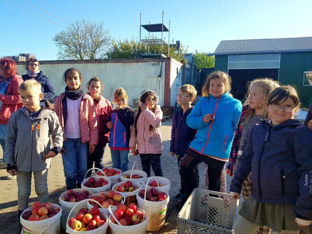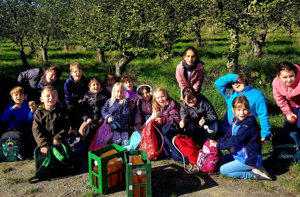 Die Klasse 2b nutzte das tolle Wetter und besuchte eine Obstplantage. Die vielen gesammelten Äpfel wurden zu Saft verarbeitet, worauf sich die Klasse nun freut: