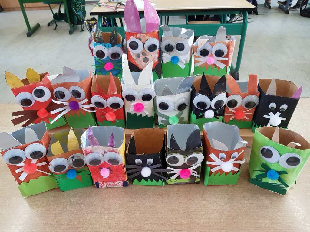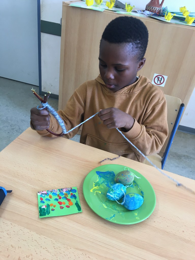 In der Klasse 0a bastelten wir Karten, Osterhasen und Hühnchen, bemalten Ostereier und wickelten Weidenzweige ein. Wir haben die Bücher „Der Eierdieb“ und „Das Osterhuhn“ vorgelesen. Vielleicht können wir ja nächstes Jahr schon selbst ein kleines Buch lesen.