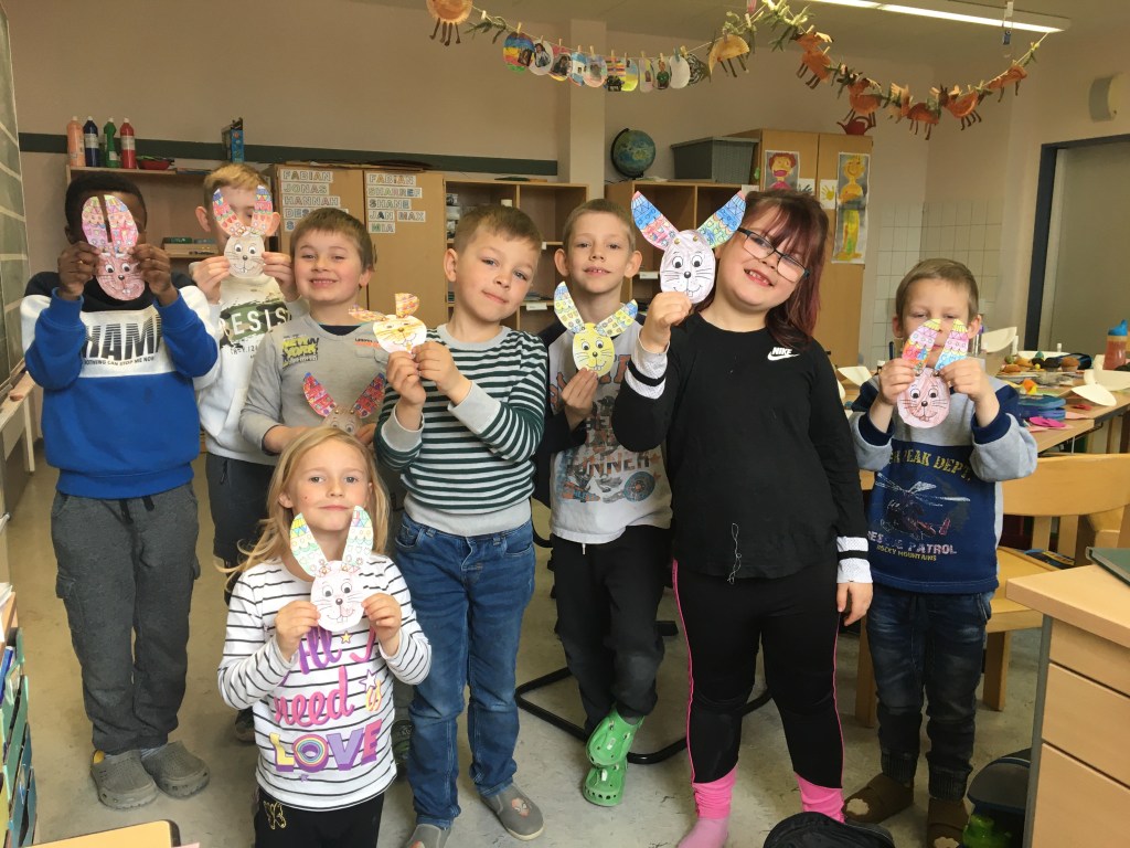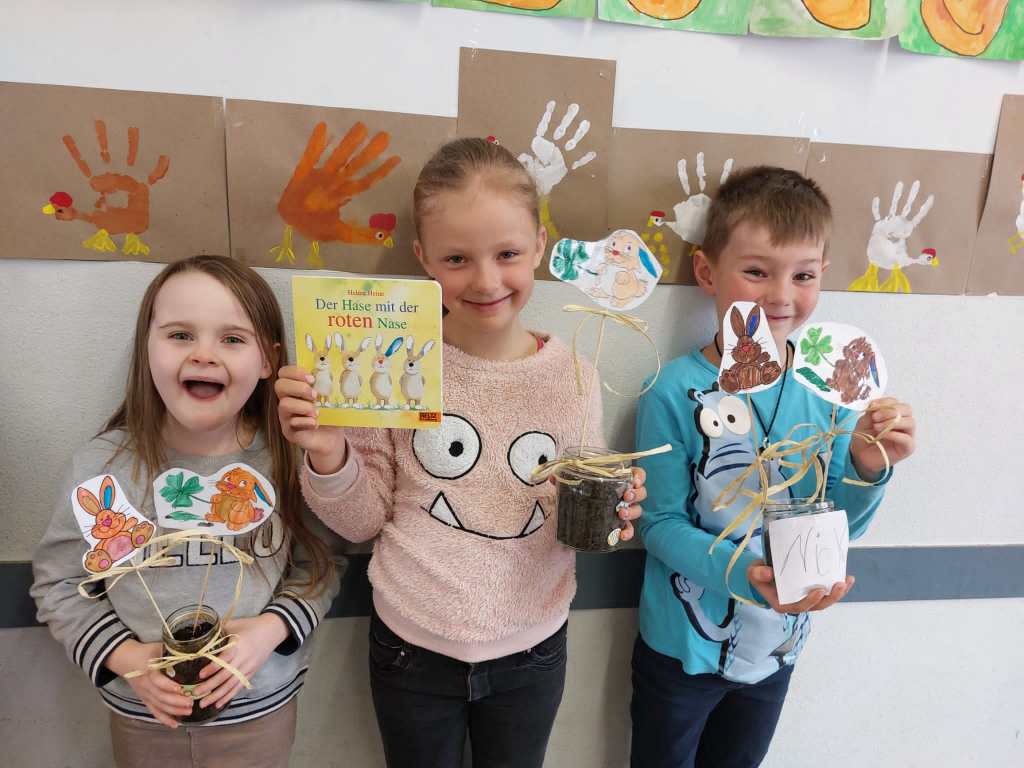 In der Klasse 1c haben wir zum Buch „Der Hase mit der roten Nase“ gebastelt und uns danach mit Hühnern beschäftigt. Die Quizfragen zum Hühnerfilm gaben den entscheidenden Tipp, wo der Osterhase die Körbchen versteckt hat.