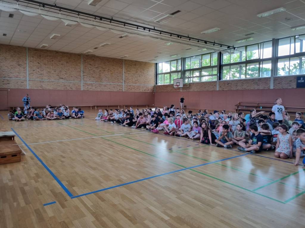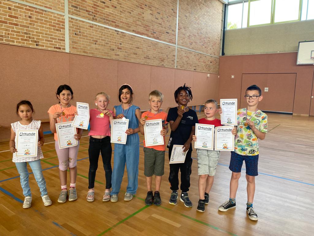 Schon am nächsten Tag konnten die Sieger in jeder Altersklasse nominiert werden. In der Sporthalle fand die Auszeichnung statt. Die jeweils 6 sportlichsten Schülerinnen und Schüler erhielten eine Urkunde. Die jeweils drei besten Schülerinnen und Schüler wurden zusätzlich mit einer Medaille geehrt. Es können nur 6 Plätze vergeben werden und manches Mal waren die Ergebnisse nur knapp an einer Platzierung vorbei. Am Ende konnte sich dennoch niemand etwas vorwerfen, denn jeder hatte alles gegeben.
