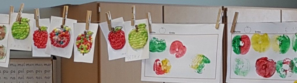 In den Klassen DFK1/a und 0/b haben die Kinder gemeinsam lustige Apfelmännchen gebastelt. Vorsichtig wurden die vielen Blätter einzeln aufgespießt und mit einem Apfel und einer Hagebutte als Kopf verziert. Wir hörten eine Apfelgeschichte und erfuhren viel Wissenswertes über den Apfel. Wer hat gut aufgepasst und kann viele Fragen beantworten? Hinterher ließen wir uns Eis mit selbstgeschnittenen geschmorten Äpfeln schmecken. Hmmmm.