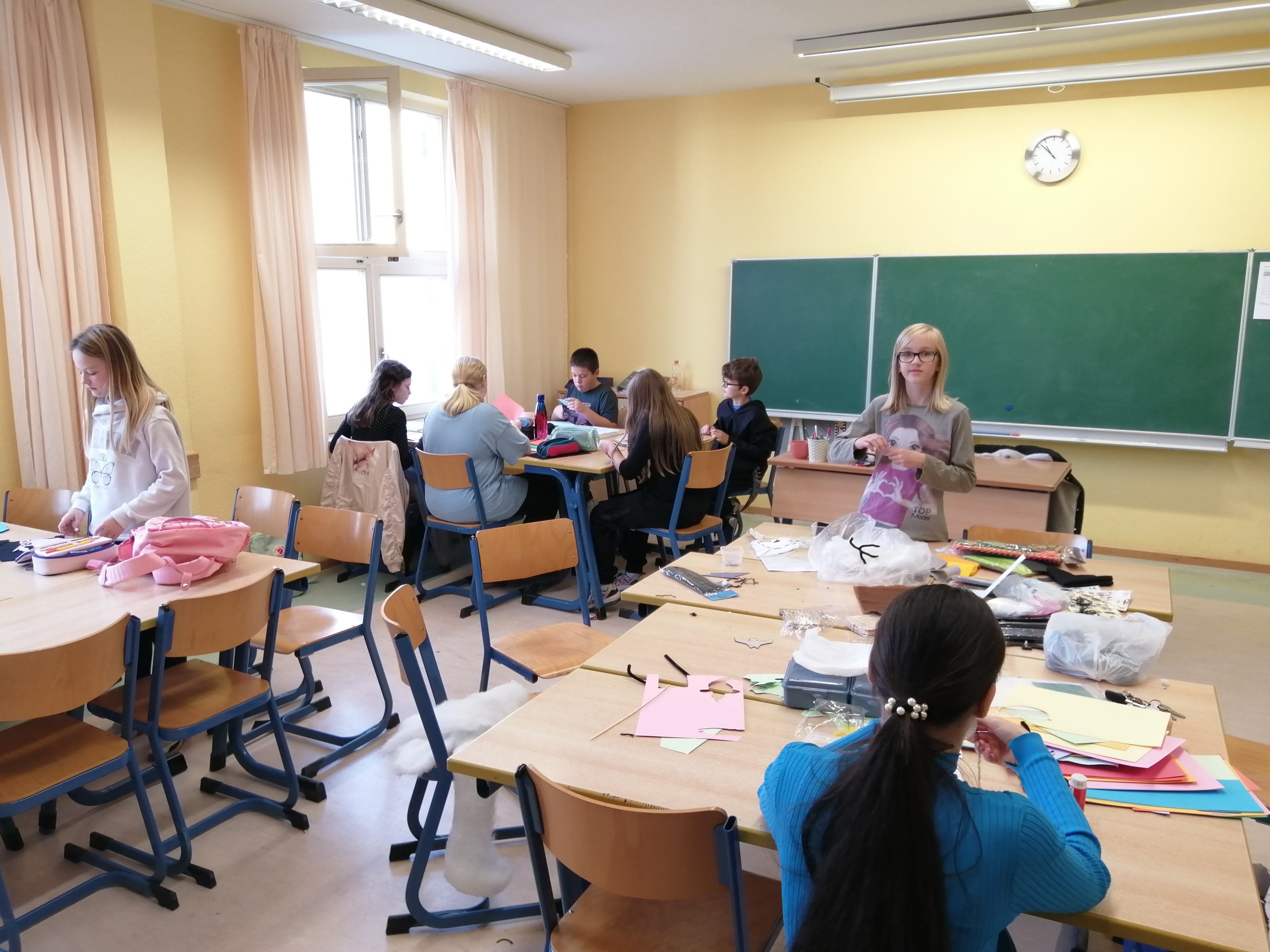 Frau Tölle bot das Basteln von Halloweendekoration an. Alle Kinder hatten Spaß beim Herstellen u.a. einer Pop-Up-Karte, einer flauschigen Wollspinne, einem Wattegespenst, einem Fledermauskartenhalter, einer Hexenkarte und Geister- bzw. Spinnendeko für einen Trinkhalm.