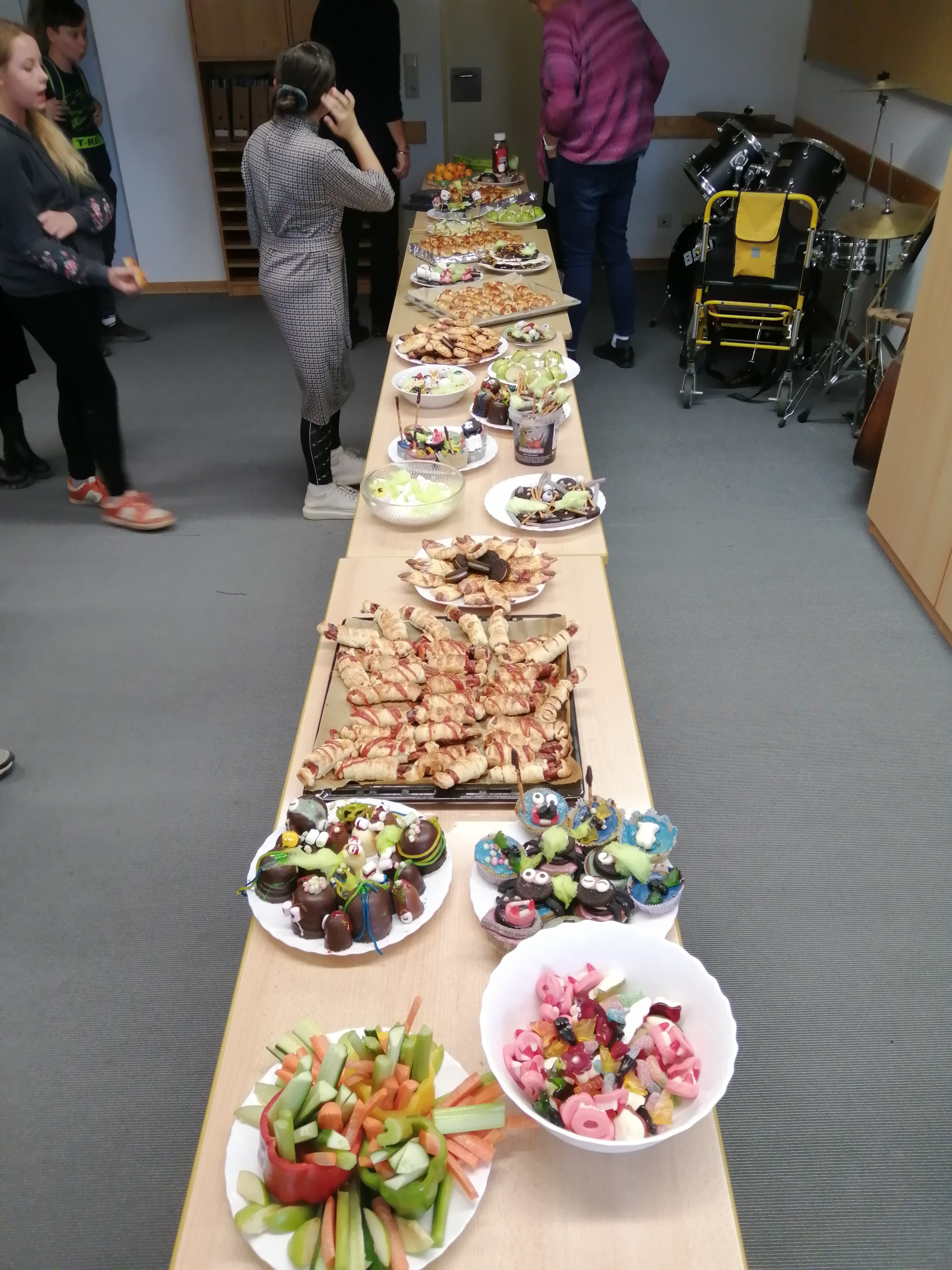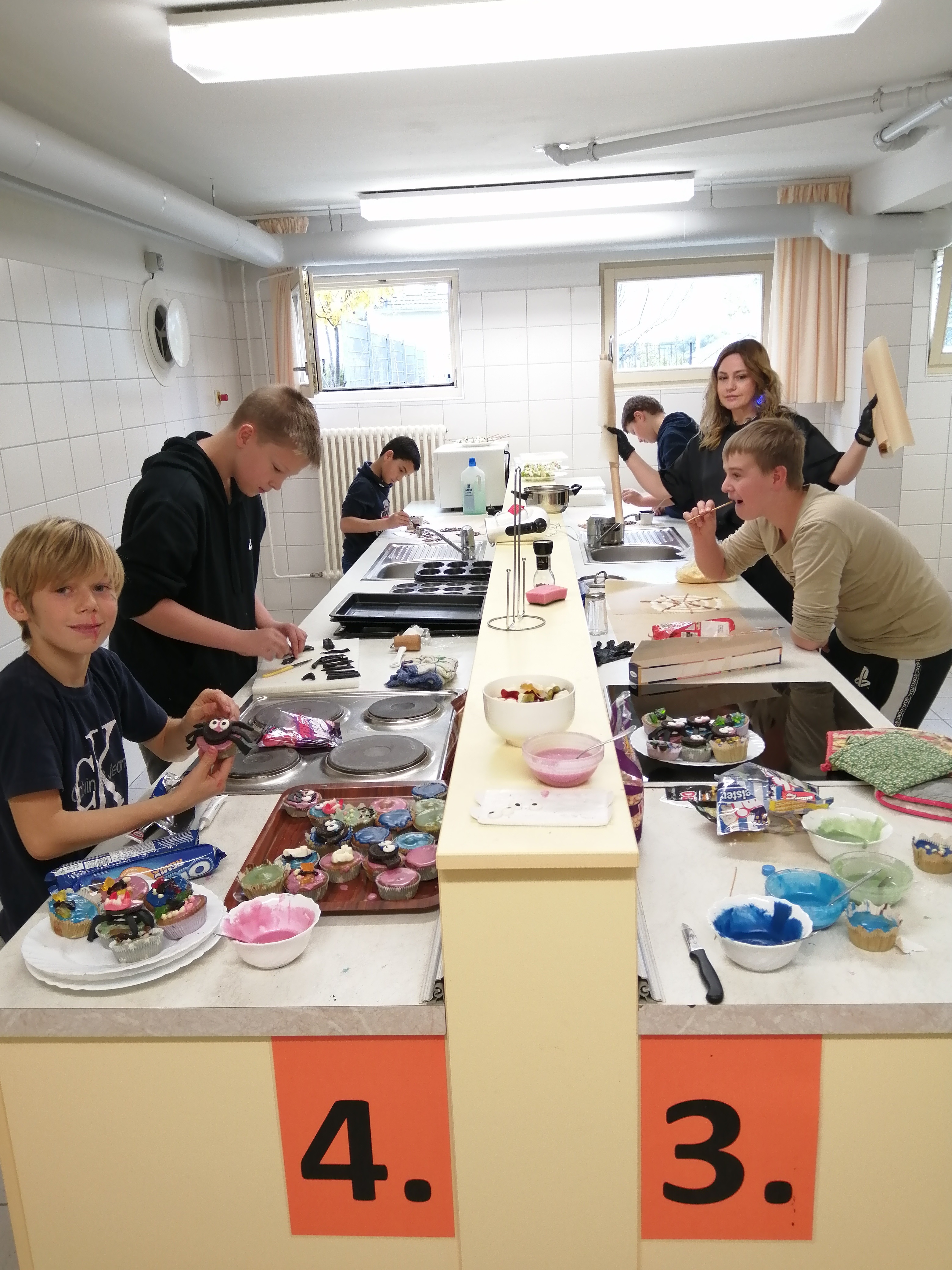 Frau Jacob und Frau Rinck waren unsere „kitchen witches“ und Herr Linda der „kitchen wizard“. Sie empfingen die Schülerinnen und Schüler in der Schulküche und stellten mit ihnen unheimlich Leckeres her: Gruselmuffins, Mumienwürstchen, Fingerkekse, um nur einiges davon zu nennen. Alle Kinder und Lehrer durften am Ende des Projekttages die Köstlichkeiten verzehren.