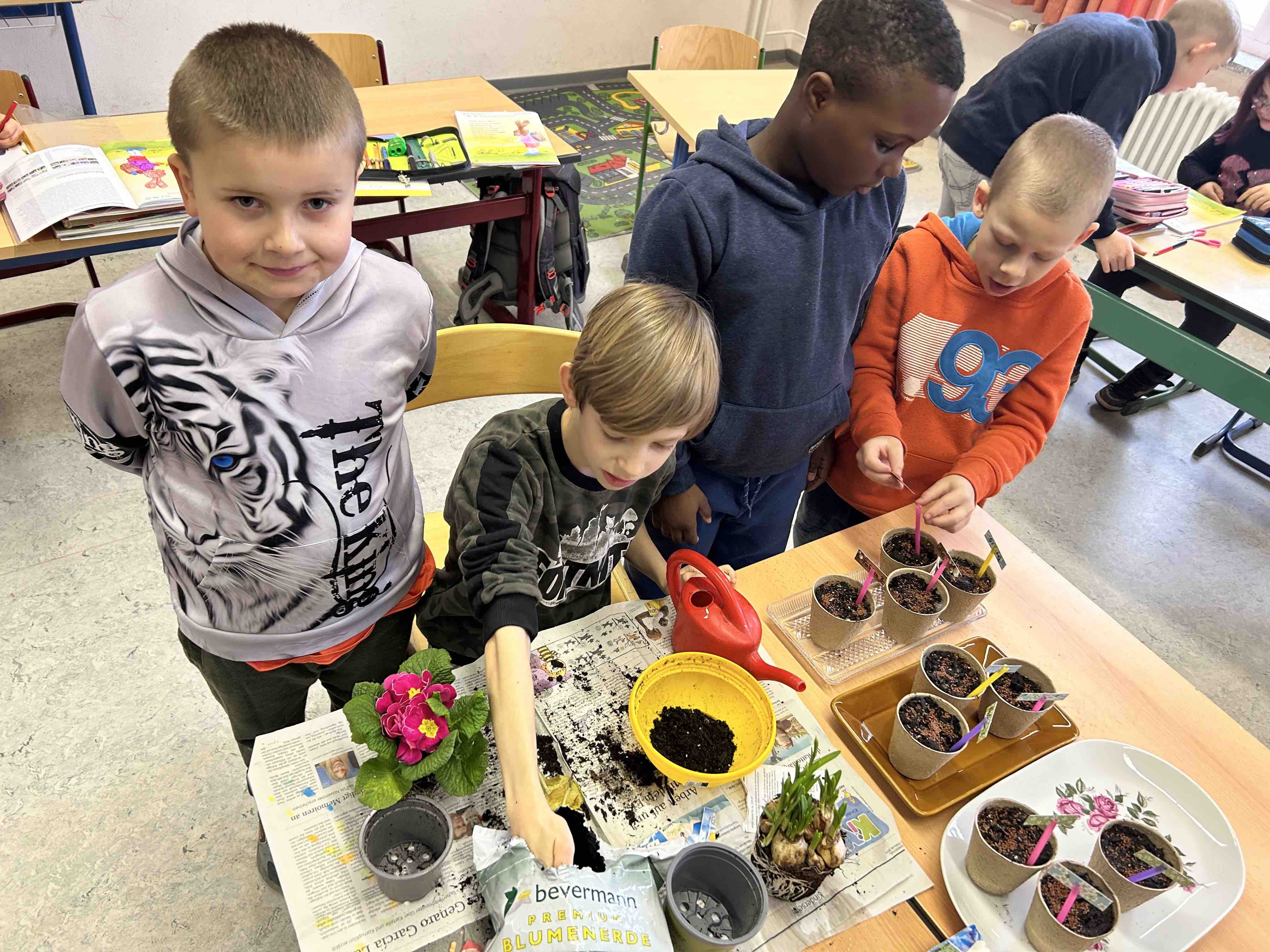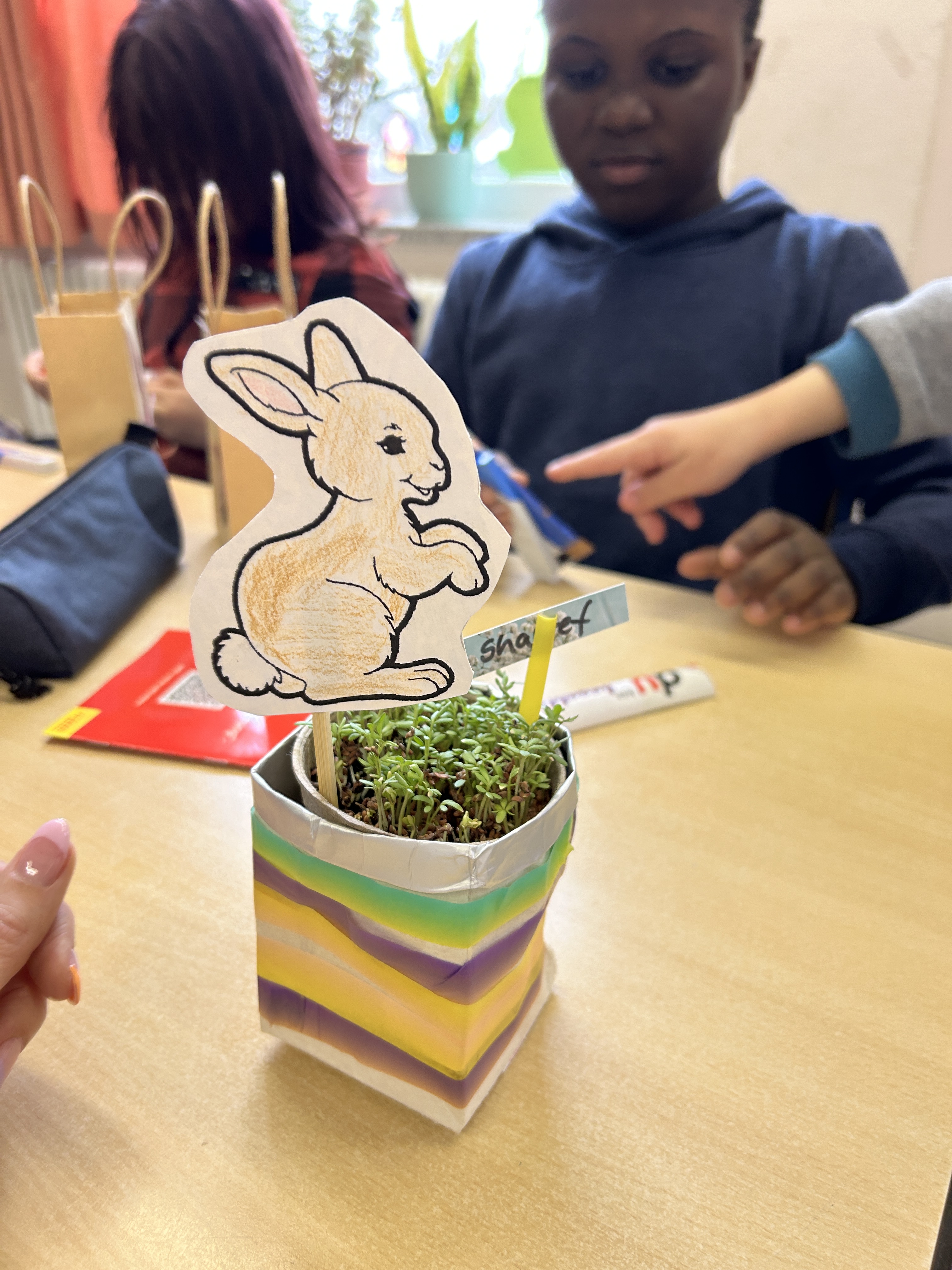 Die Schüler und Schülerinnen der DFK1a haben Kresse gepflanzt und können sie heute mit nach Hause nehmen, außerdem wurden Stiftehalter aus Tetrapaks hergestellt und dekoriert. Die selbstgebastelten Tüten hat der Osterhase reichlich befüllt.
