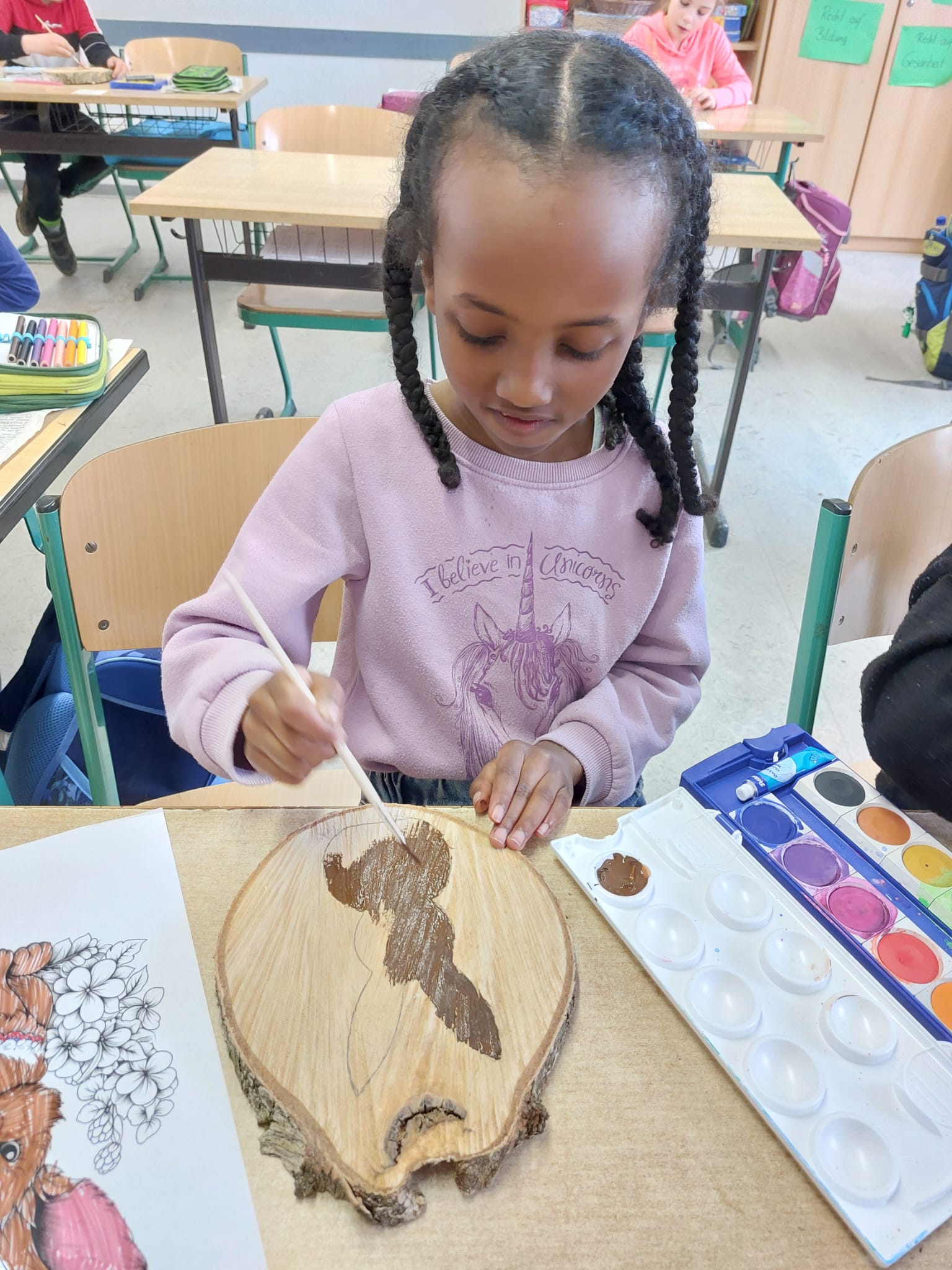 In der Klasse 2c haben die Schülerinnen und Schüler Holzscheiben glatt geschliffen und bemalt.