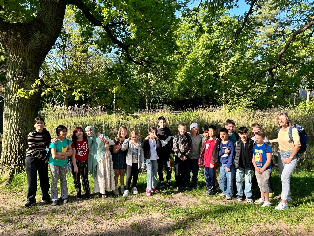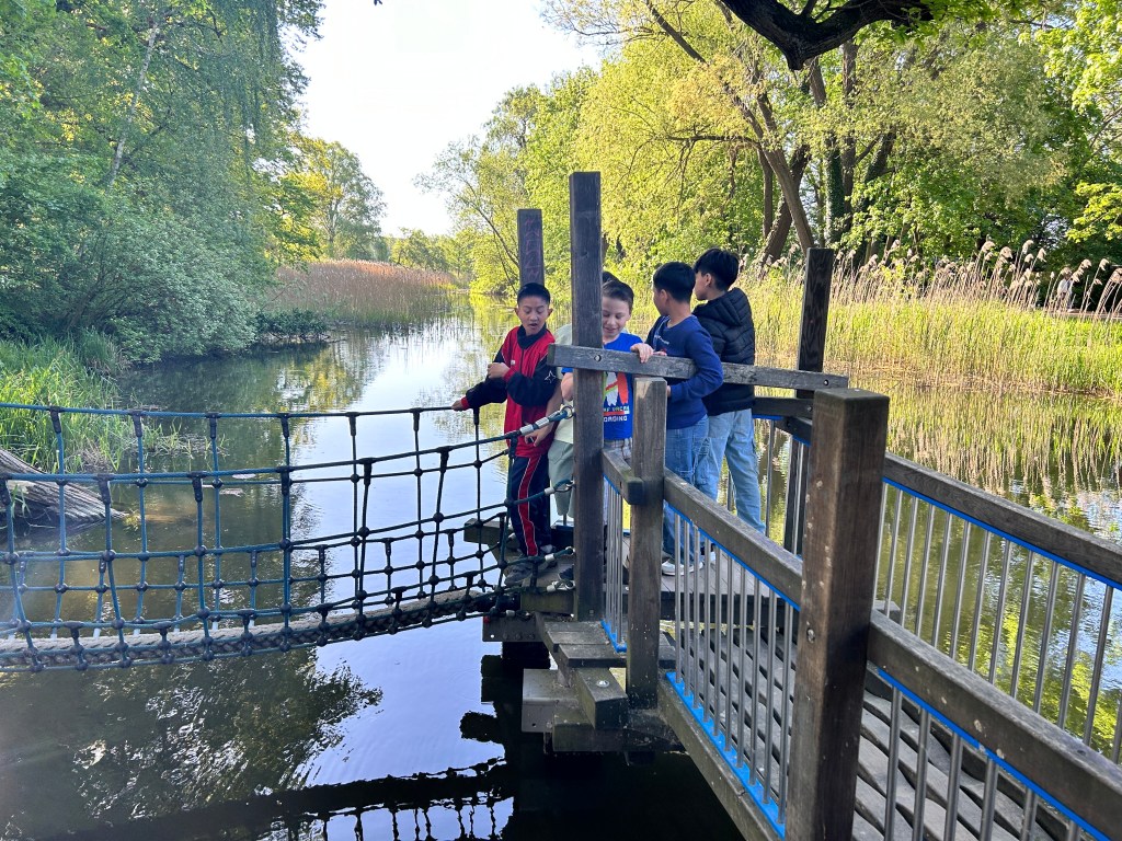 Wir machten uns bei schönstem Wetter am 02. Mai 8 Uhr auf den Weg und gingen zu Fuß in Richtung Bibliothek. Vor unserem Termin nutzten wir den Wasserspielplatz an den Teichen noch zum Frühstücken im Freien und zum Spielen.