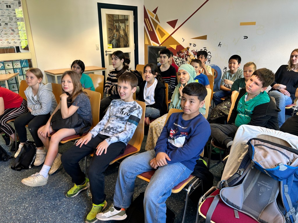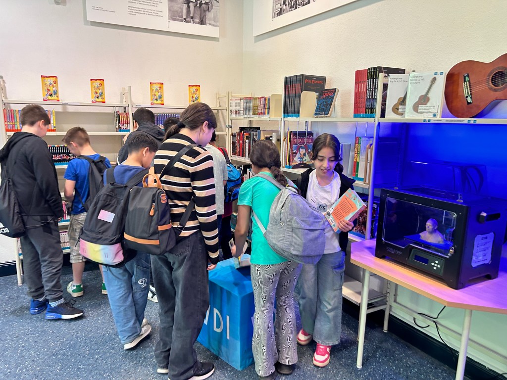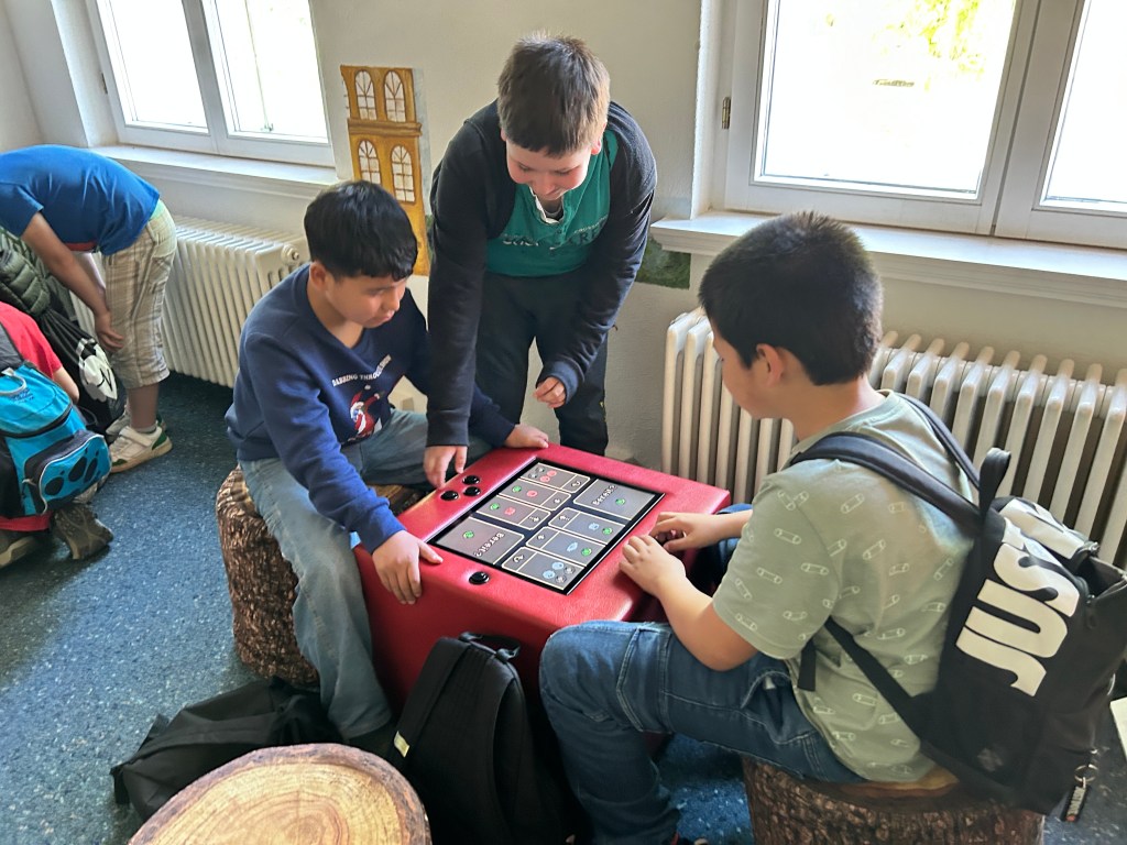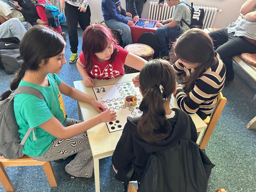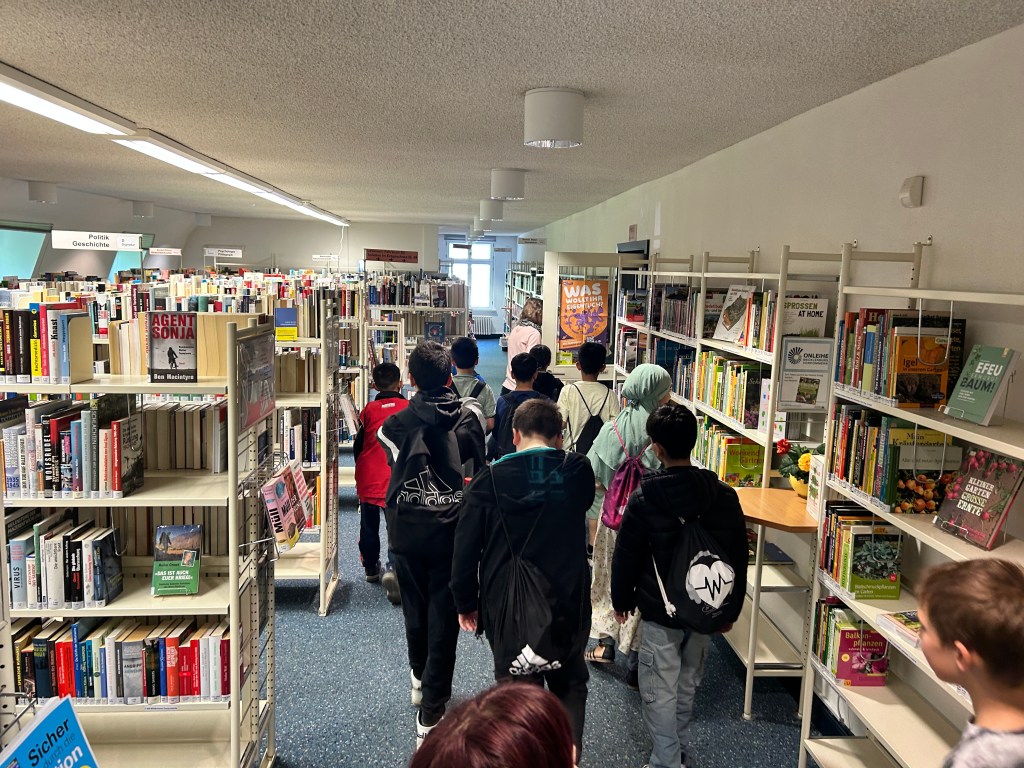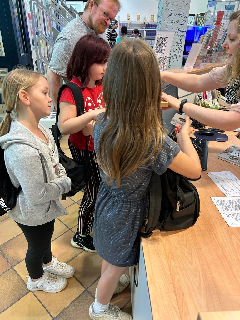 Im Anschluss haben wir noch die Bibliothek erkundet. Manche Kinder haben ein spannendes Buch zum Ausleihen gefunden. Viele nutzten die digitalen Brettspiele oder stöberten durch die Bücherreihen. Neue Bekanntschaften wurden auch geschlossen.