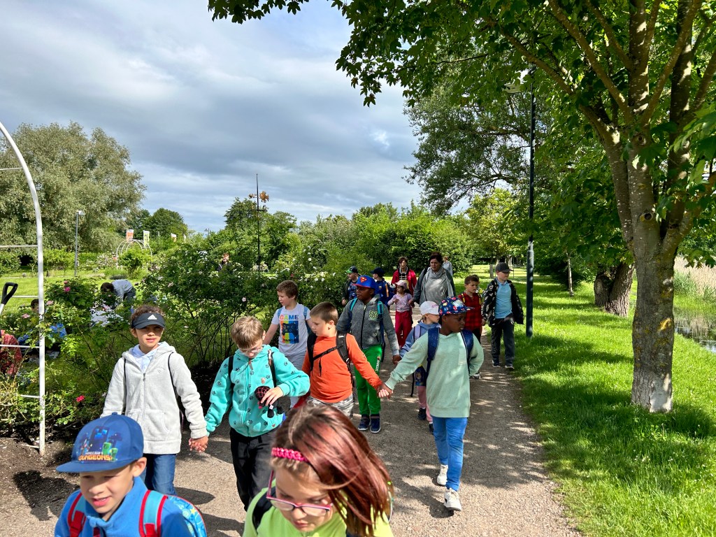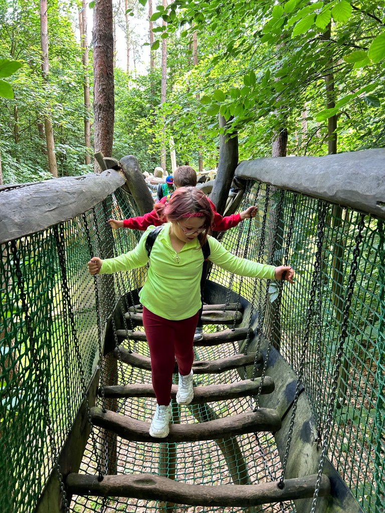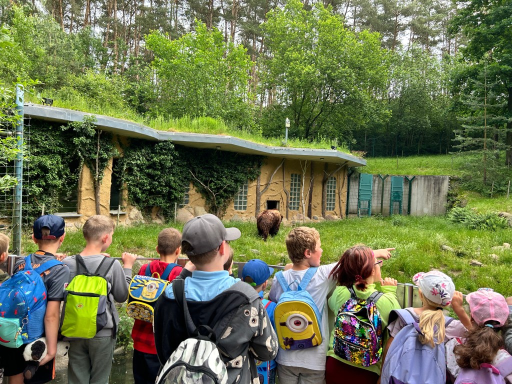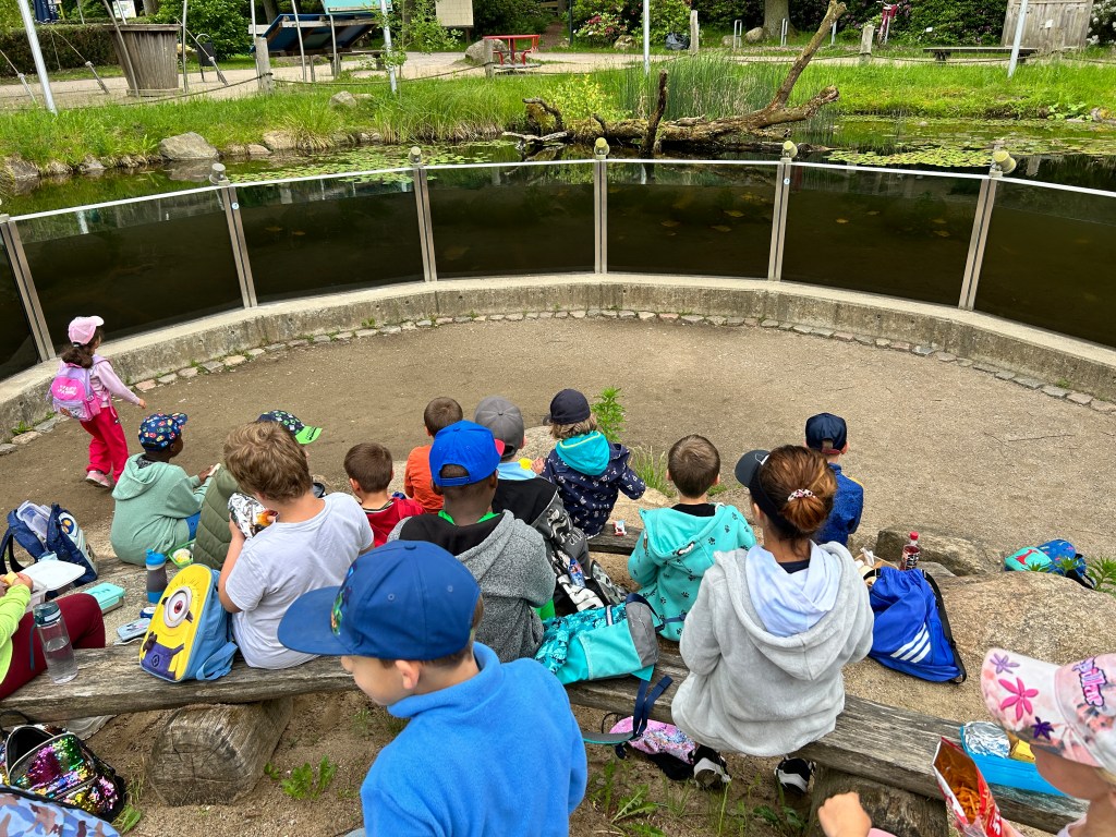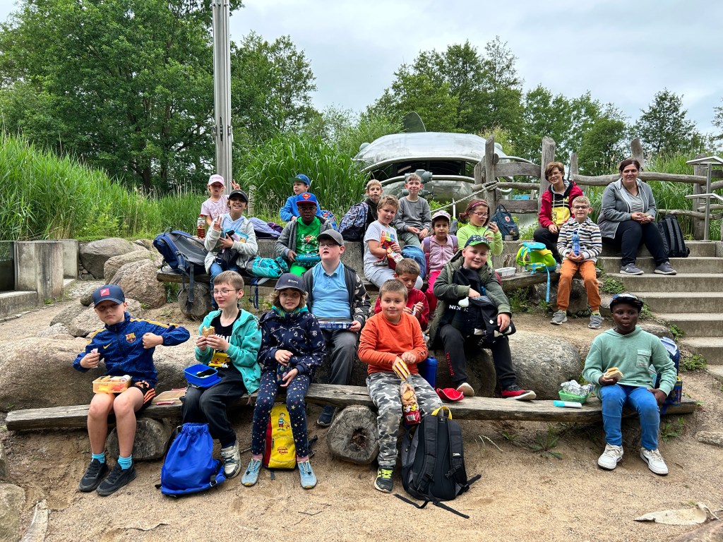 Die beiden DFK1-Klassen fieberten schon seit Wochen unserem Ausflug in den Wildpark entgegen. Eigentlich wurden wir täglich gefragt, wann wir in den Wildpark fahren. Die Vorfreude war einfach köstlich. Am 29.05.2024 war es dann endlich so weit. Mit sehr aufgeregten Kindern machten wir uns mit dem Stadtbus auf den Weg. Schon die Hinfahrt war ein kleines Erlebnis, weil wir am Schloss vorbeikamen und auch umsteigen mussten. Außerdem kamen wir an manch einem Wohnhaus der Schüler oder Omas und Tanten vorbei und dies erzeugte immer wieder Freude.