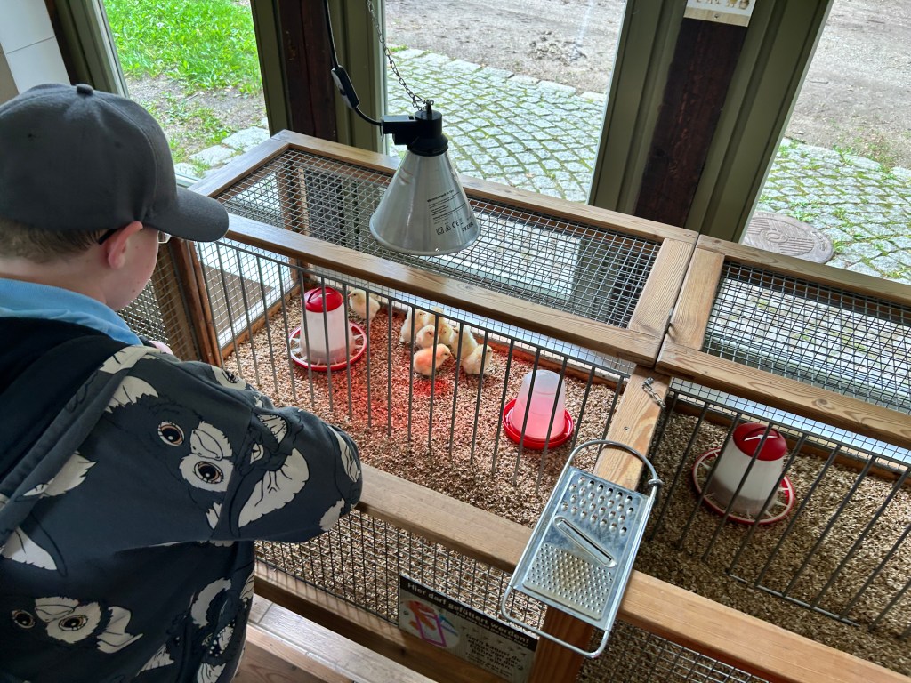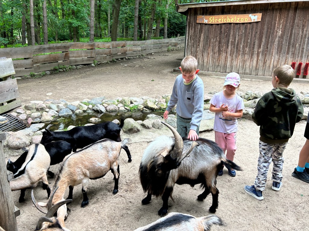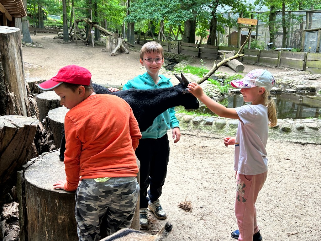 Dann gingen wir zu den Hühnern und konnten ganz frisch geschlüpfte Küken betrachten und sogar füttern – eine Pflegerin war nämlich gerade anwesend. Danach besuchten wir die Ziegen im Streichelzoo. Wir waren an diesem Tag die ersten Besucher im Wildpark und die Ziegen begrüßten uns ziemlich wild und stürmisch. Sie stürmten regelrecht auf die gekauften Futtertüten zu. Das jagte ein paar Kindern schon Angst ein und sie verließen unter unserer Begleitung die Streichelanlage.