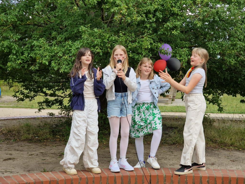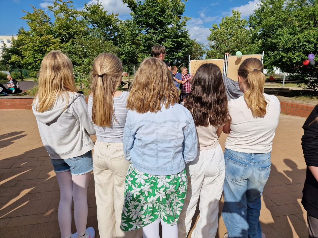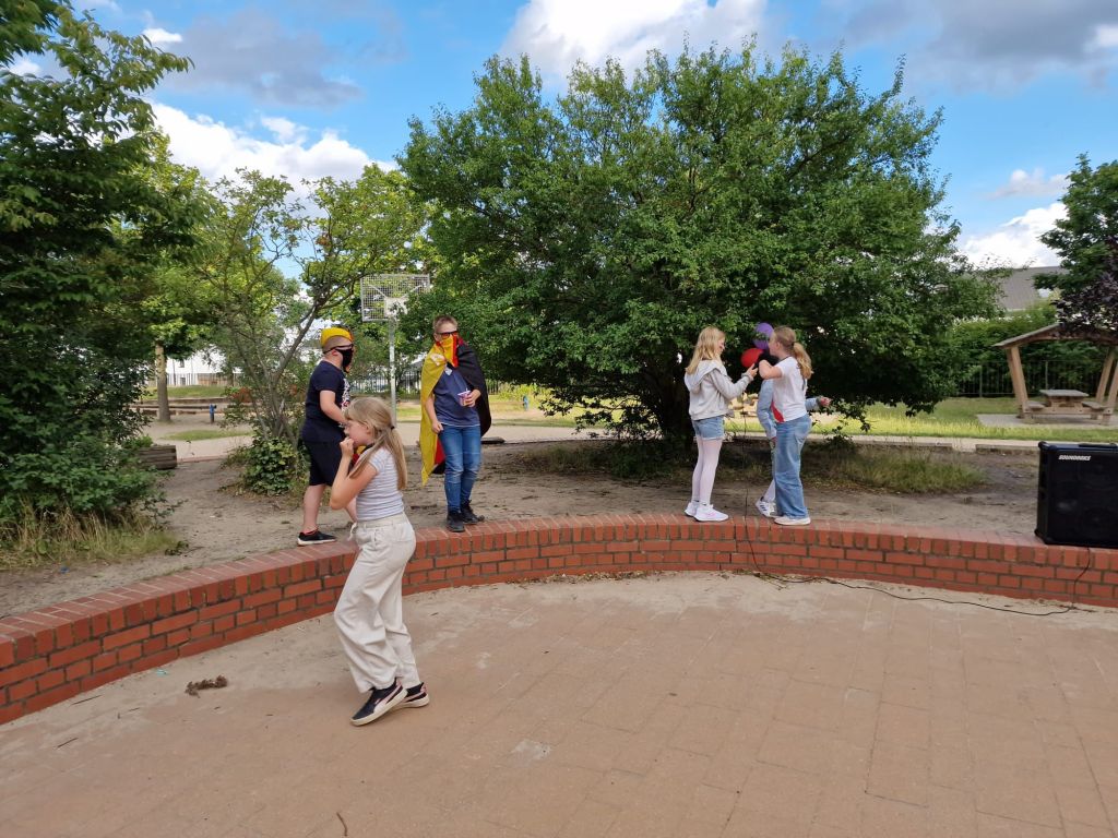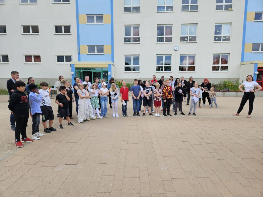 Wenn die Sommerferien vor der Tür stehen, bedeutet das für die Mädchen und Jungs ein baldiges Abschiednehmen von der Grundschule. Es stehen große Veränderungen bevor und die Kinder freuen sich auf die neue Schule. Die Eltern der 4b organisierten den Abschied für die Kinder und luden dazu ihre Lehrer und Erzieher mit ein. Es wurden emotionale Worte zur Grundschulzeit vorgetragen, etwas vorgetanzt zu dem Lied „Wir sind zusammen groß, wir sind zusammen eins“, das Lied „Ein Hoch auf uns“ gesungen, ein Theaterstück aufgeführt und sogar ein Abschiedsvideo aus dem Hortbereich angeschaut. Kein Auge blieb hier trocken.