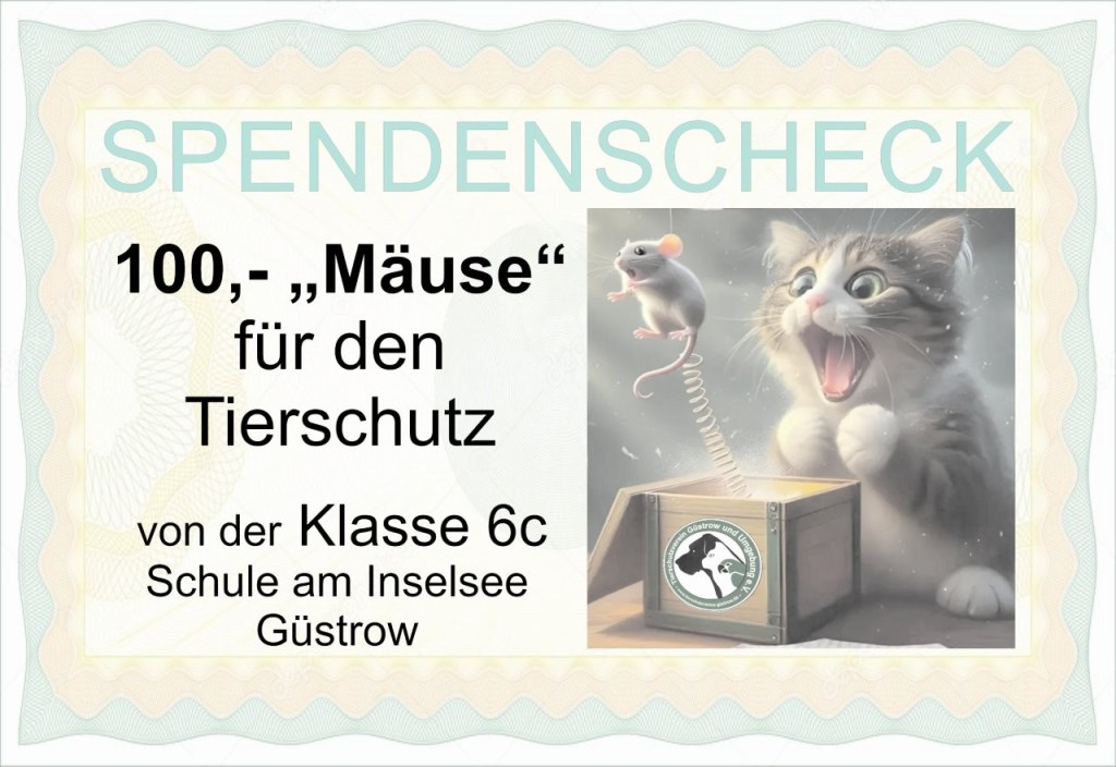 Dank der Unterstützung der Eltern kamen viele Kuchen und durch den Appetit der Schulgemeinschaft ein stattliches Sümmchen Geld zusammen. Die Einnahmen von 157,10 € werden z.T. für die Klassenfahrt gespart. 57,10 € werden gespendet. Aus den vielen Möglichkeiten der Spendenempfänger wählten die Kinder den Güstrower Tierschutz aus. Die Klassenlehrerin rundete den Spendenbetrag auf 100 € auf. Dieser sollte in Form eines Spendenschecks „Mäuse für die Katzen“ persönlich an den Tierschutz übergeben werden.