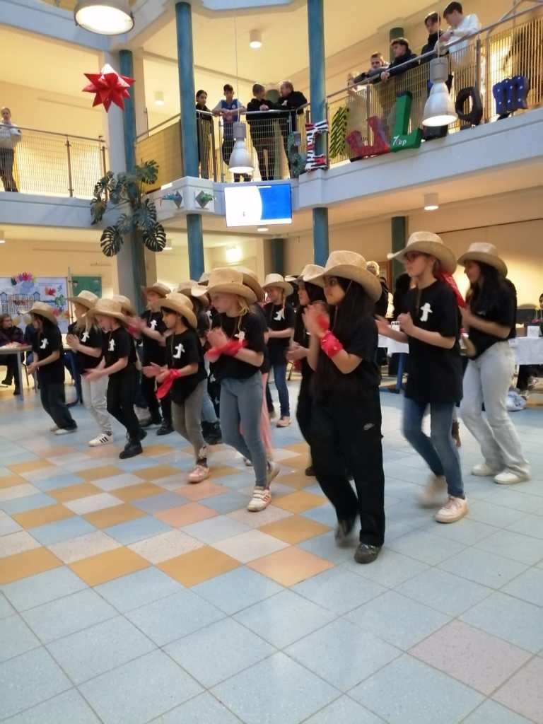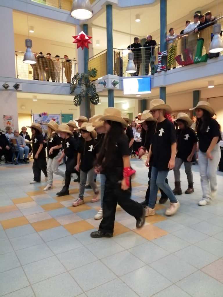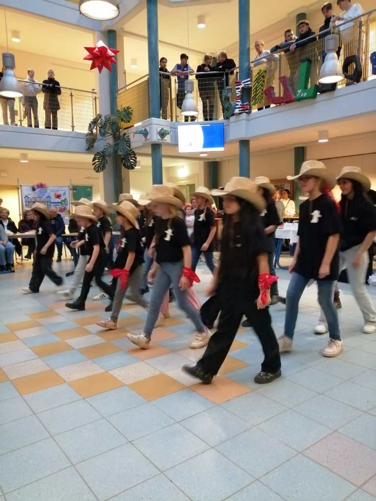 Kinder der 3. bis 6. Klasse zeigten stolz, was sie in den vergangenen Wochen gelernt hatten. Die jungen Tänzerinnen und Tänzer trugen einheitliche T-Shirts und Cowboyhüte, was dem Auftritt einen authentischen Western-Look verlieh.