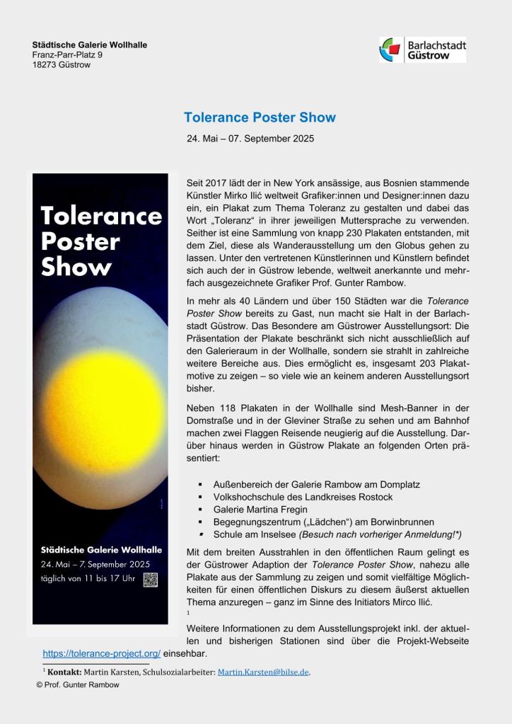 Für die Möglichkeit, die Kreationen anzusehen, dankt die Schule neben unserem Schulsozialarbeiter Herrn Karsten und dem ausstellenden Künstler der Städtischen Wollhalle, in welcher ebenfalls eine diesbezügliche Ausstellung zu bewundern ist. Nähere Informationen hierzu findet ihr im Folgenden: