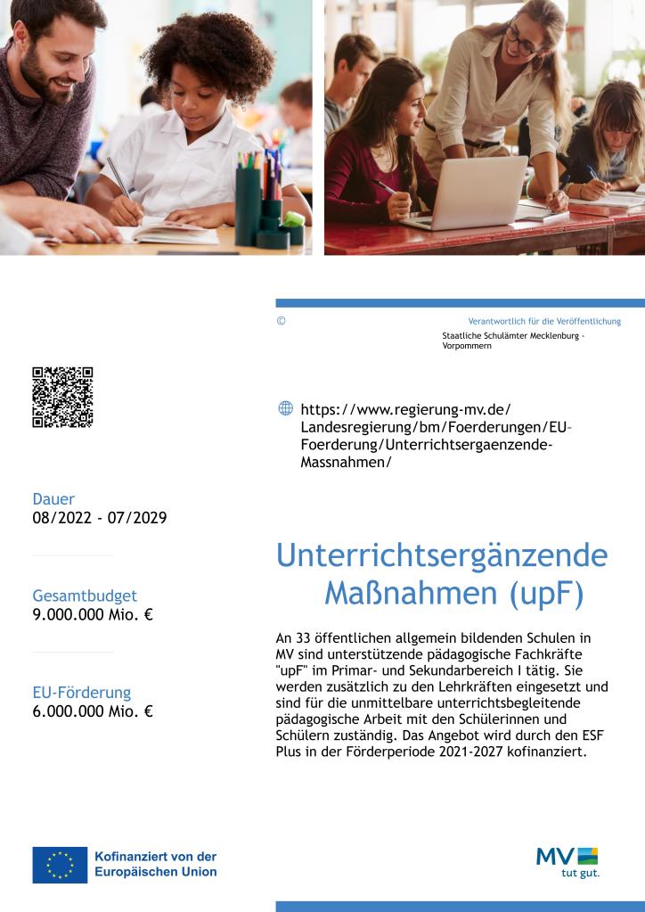 Das Projekt Unterrichtsergänzende Maßnahmen (upF) wird im Rahmen des ESF Plus Programms 2021-2027 des Landes Mecklenburg-Vorpommern durch das Ministerium für Bildung und Kindertagesförderung aus Mitteln des Europäischen Sozialfonds Plus der Europäischen Union sowie des Landes Mecklenburg-Vorpommern gefördert.
