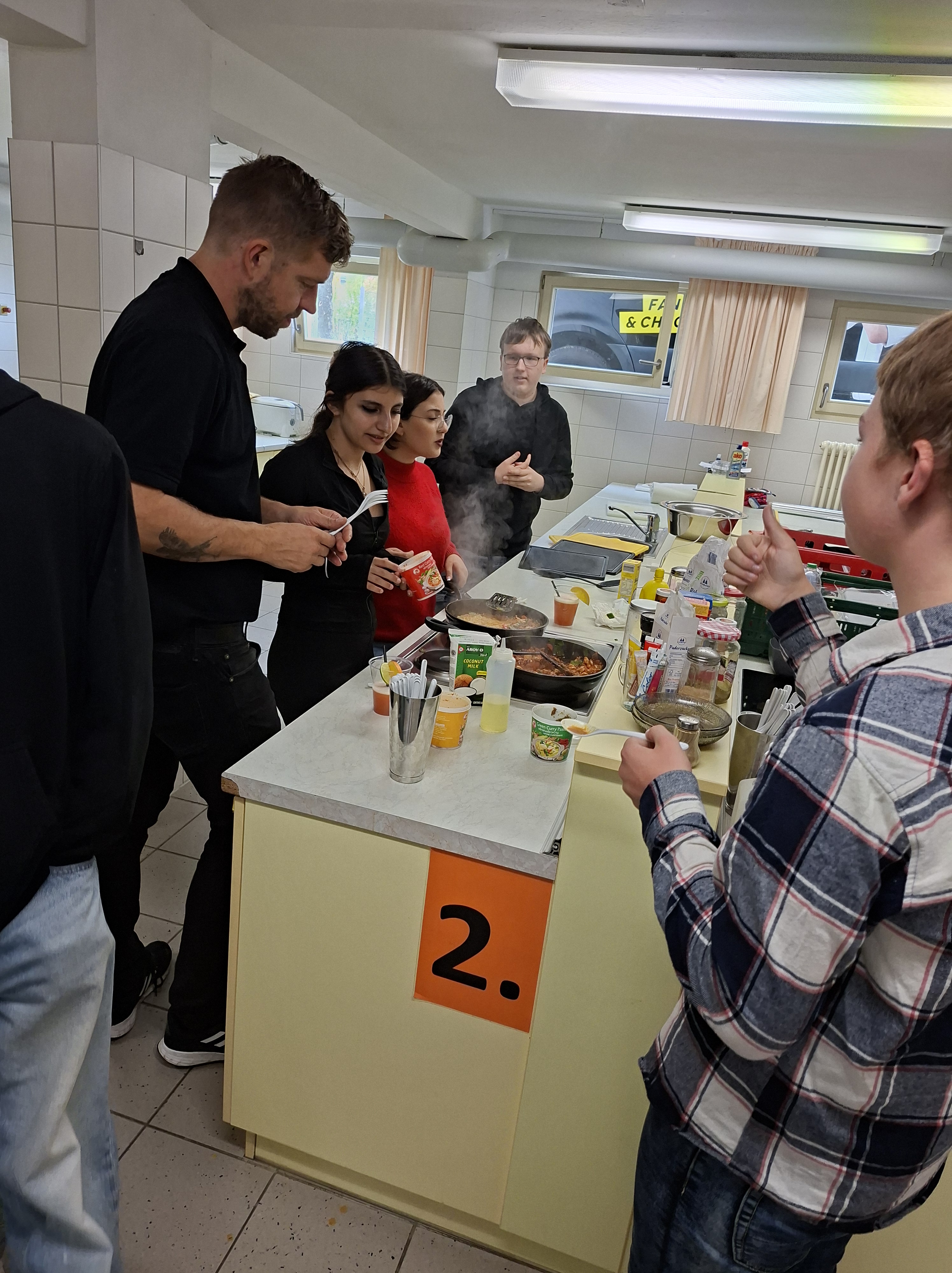 Eine Klasse erhielt zudem Besuch von unserem Bürgermeister Sascha Zimmermann, welcher den Jugendlichen über die Schulter schaute. Die andere Hälfte der Klasse, die nicht in der Schulküche beschäftigt war, hatte viel Spaß mit dem Schulsozialarbeiter, Herrn Karsten. Er half den Schüler*innen dabei, ihre Stärken und Fähigkeiten zu entdecken und einzuschätzen. Anschließend wurde die Teamfähigkeit getestet, indem ein Turm aus Nudeln gebaut wurde. Es war ein interessanter Projekttag, an dem genüsslich geschlemmt wurde.
